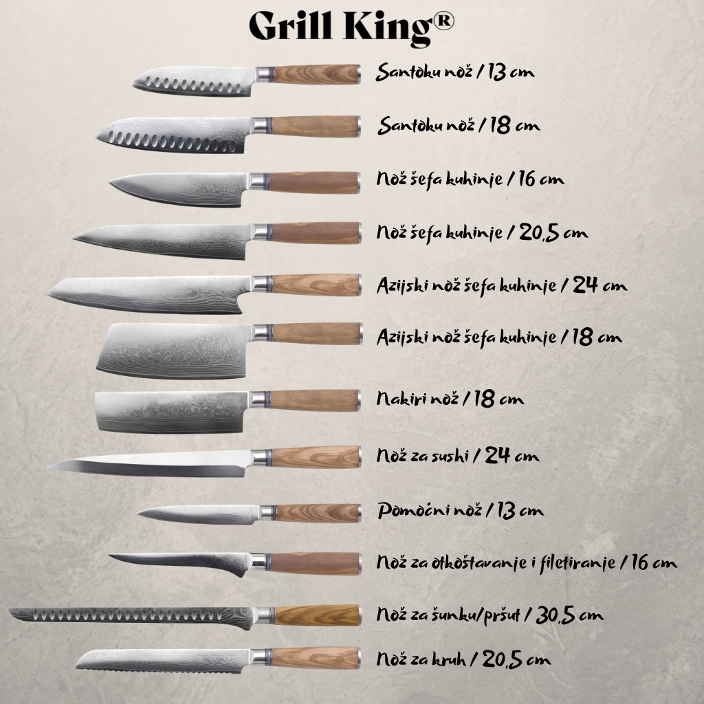 Neka Grill King postane vaš kuhinjski nož! Svaki profesionalni kuvar mora imati vlastiti nož na što sugerira japanska izreka: U nožu se nalaze duša i srce kuvara. Takođe, Grill King Damascus nož može biti i odličan poklon, jer smo sigurni da će u originalnoj drvenoj kutijici u kojoj je pohranjen oduševiti svakog kućnog ili profesionalnog kuvara.